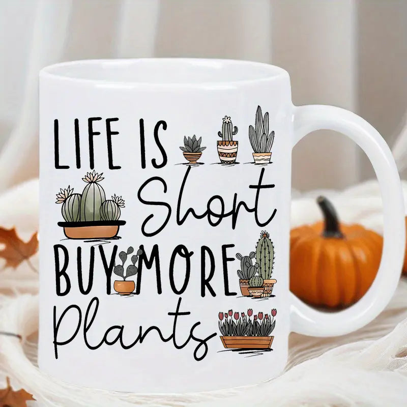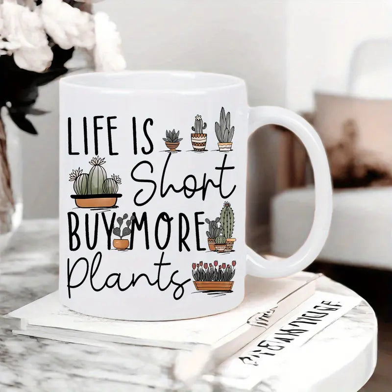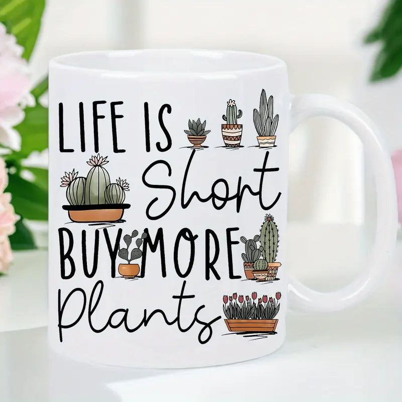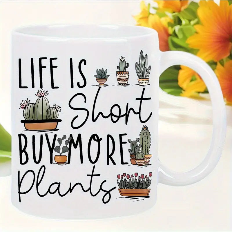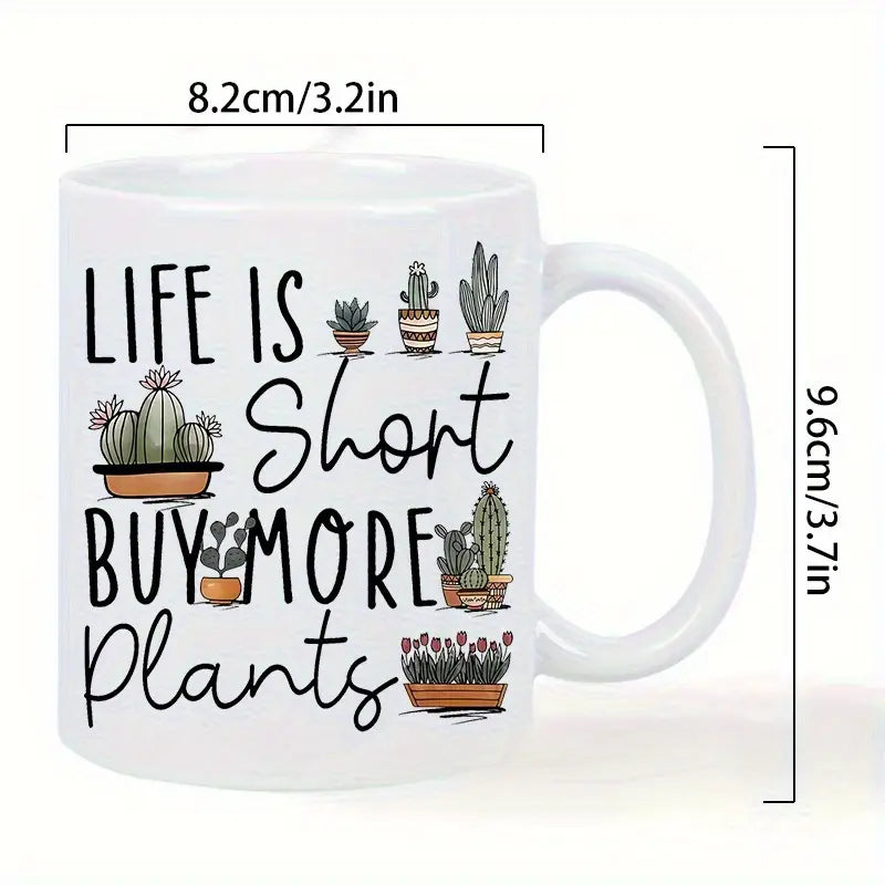 1pc 11oz Ceramic Coffee Mug - "Life is Short, Buy More Plants" Design - Insulated, Reusable, Hand Wash Only - Ideal Gift for Birthdays, Holidays, Christmas, New Year, Valentine'S Day