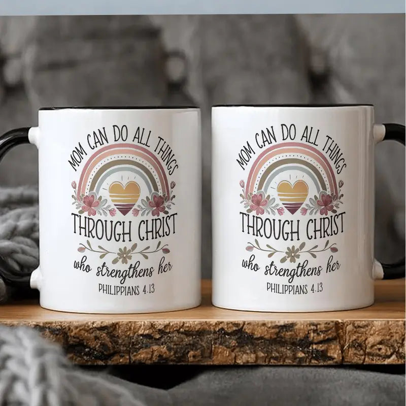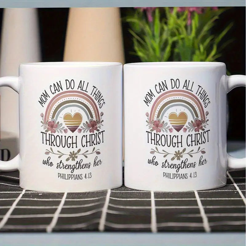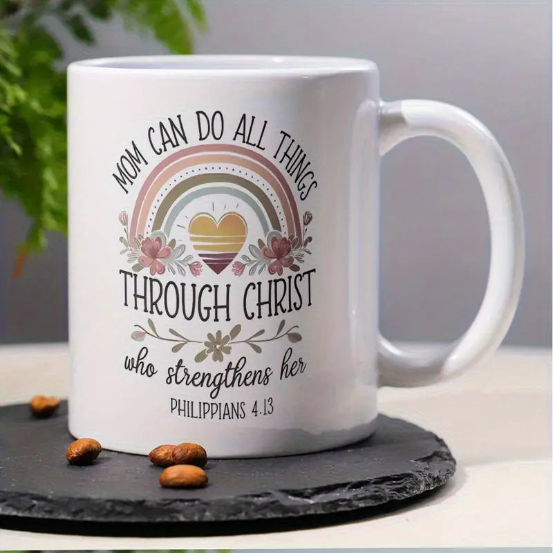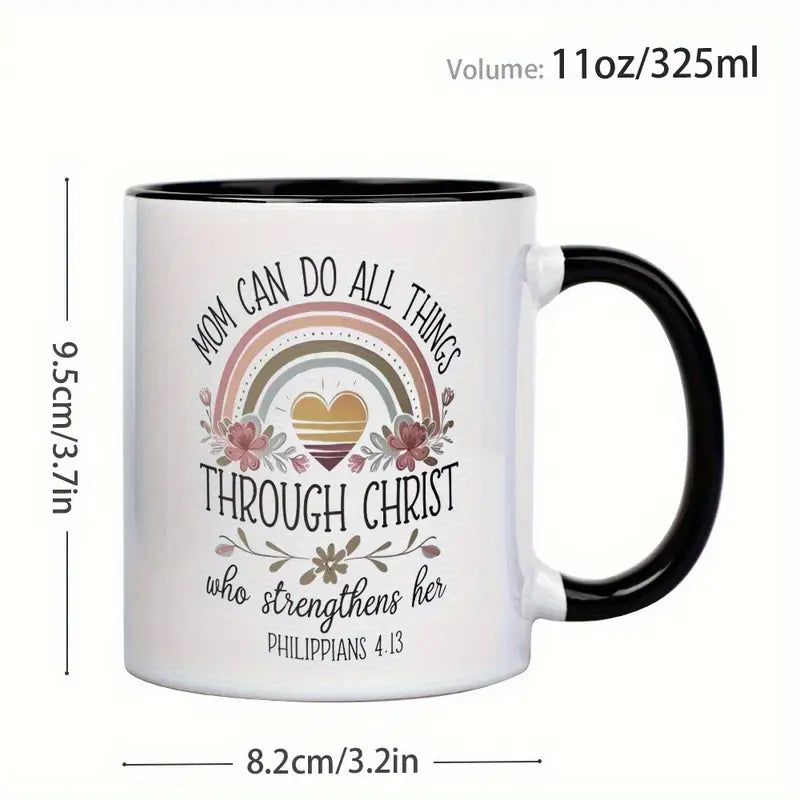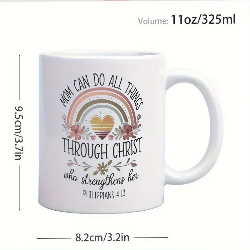 1pc 11oz Ceramic Coffee Mug - "Mom Can Do All Things Through Christ" Bible Verse (Philippians 4:13) with Rainbow & Floral Design, Insulated Reusable Cup, Dishwasher Safe - Inspirational Gift for Christian Moms, Wives, Grandmas