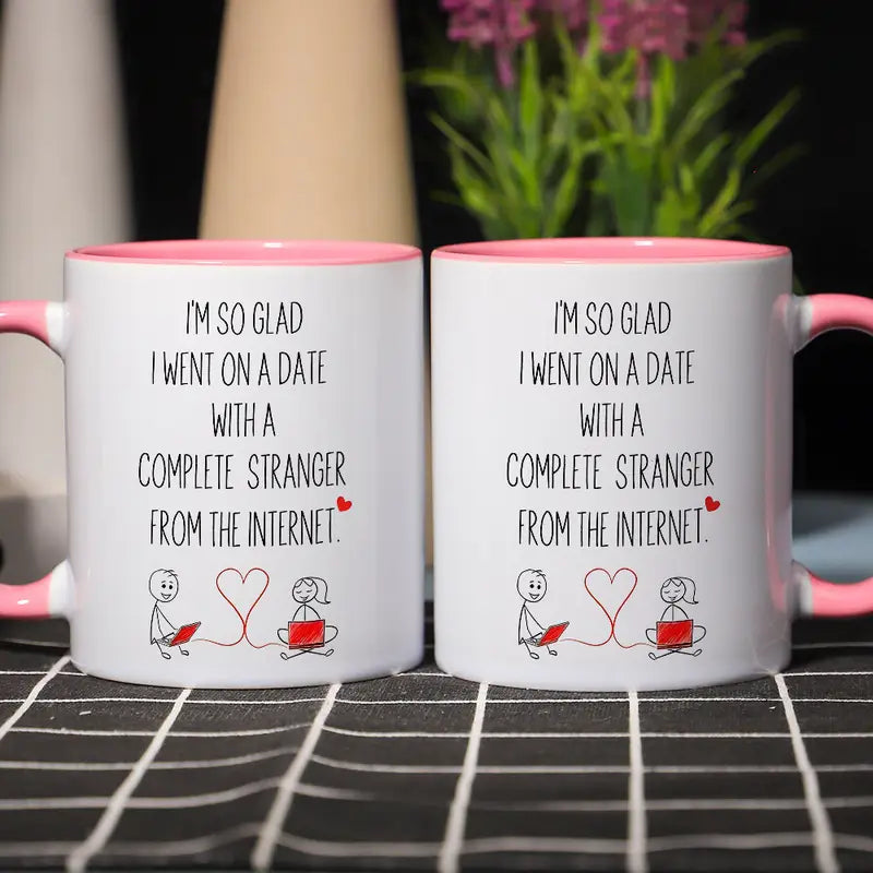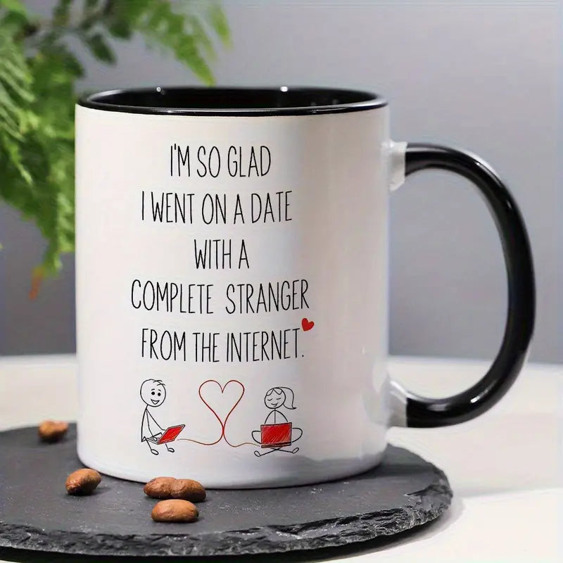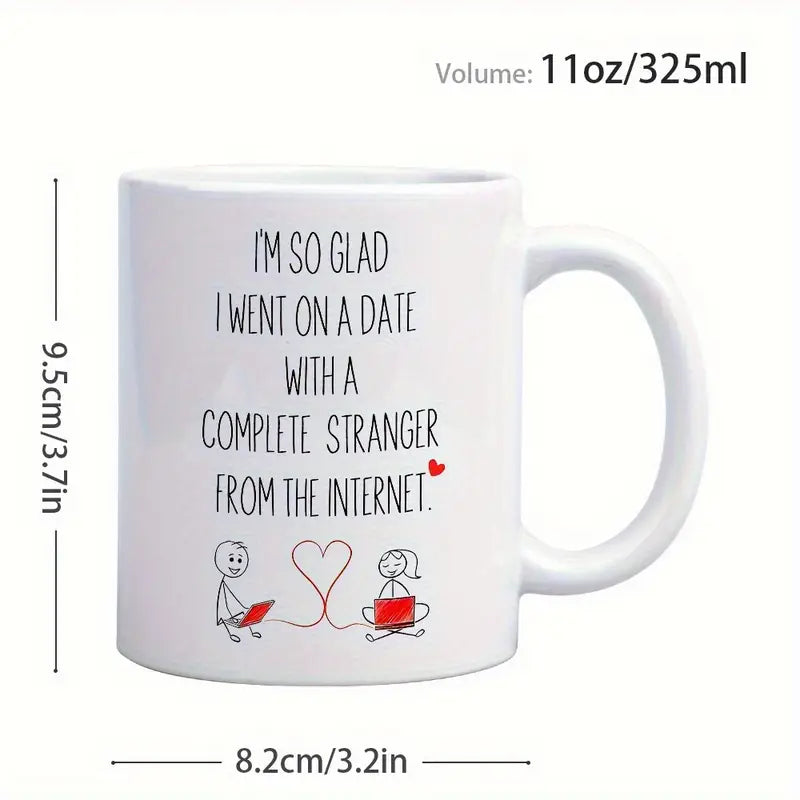 1pc 11oz Romantic Anniversary Ceramic Mug - "I'm So Glad I Went on a Date with a Complete Stranger from the Internet" Design, White with Pink Accents
