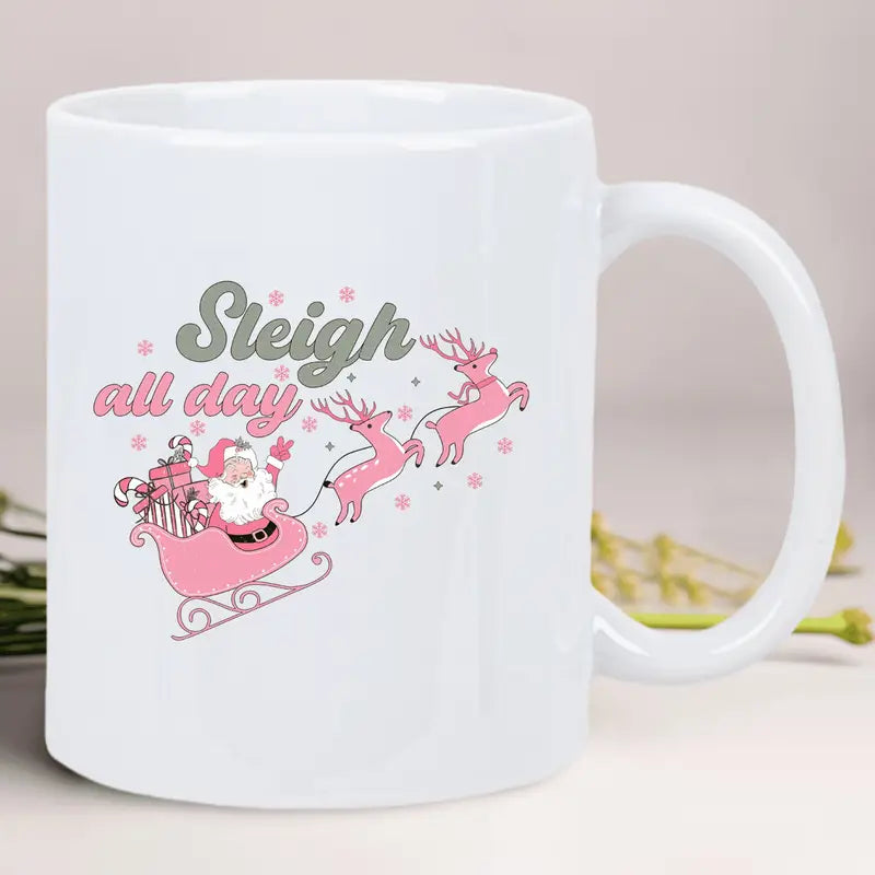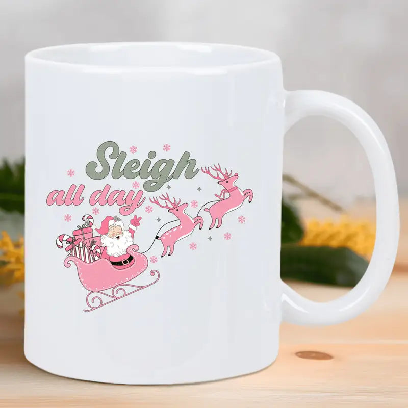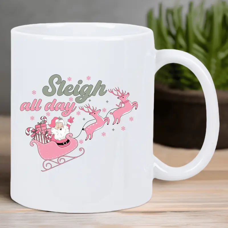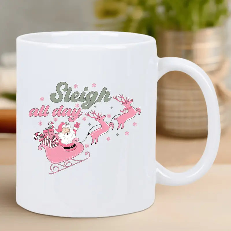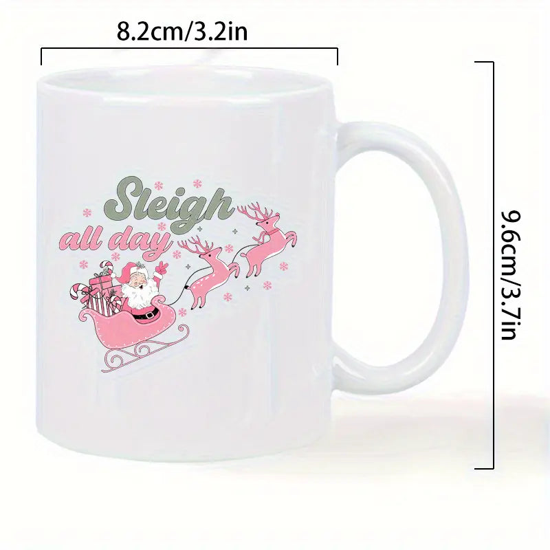 Festive Santa Sleigh & Reindeer Ceramic Coffee Mug - Insulated, Reusable White Mug with "Sleigh All Day" Design, Perfect for Holiday Gifting