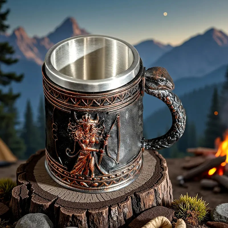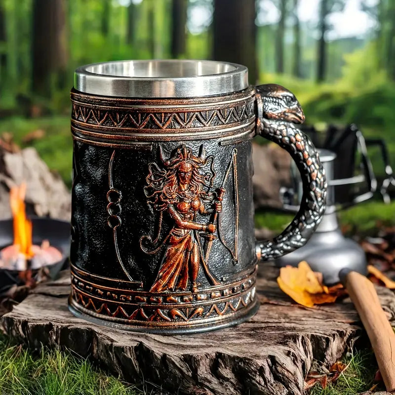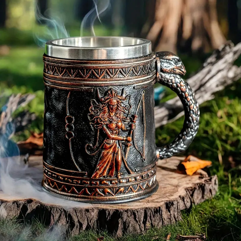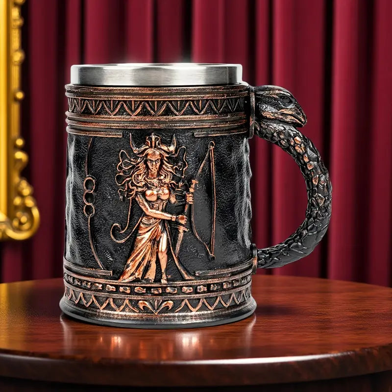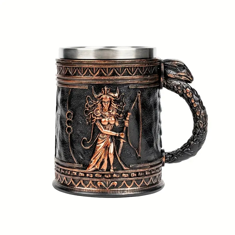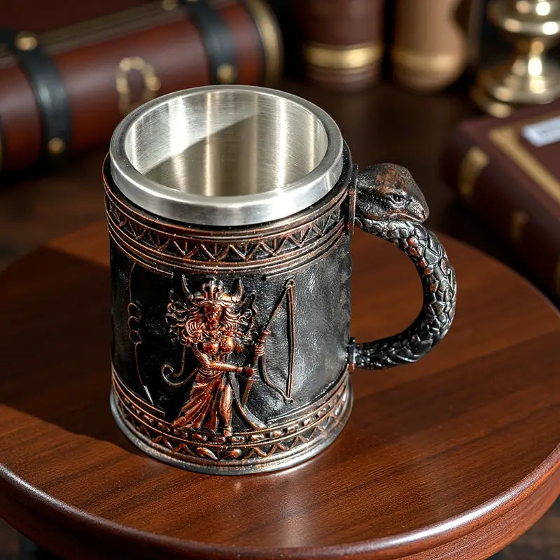 Medusa Greek Mythology Stainless Steel Beer Mug with Resin Accents - Insulated Non-Slip Oval Cup for Coffee, Beer & Wine - Reusable Gift for Halloween, Christmas, Father’s Day, Mother’s Day, Festive Drinkware